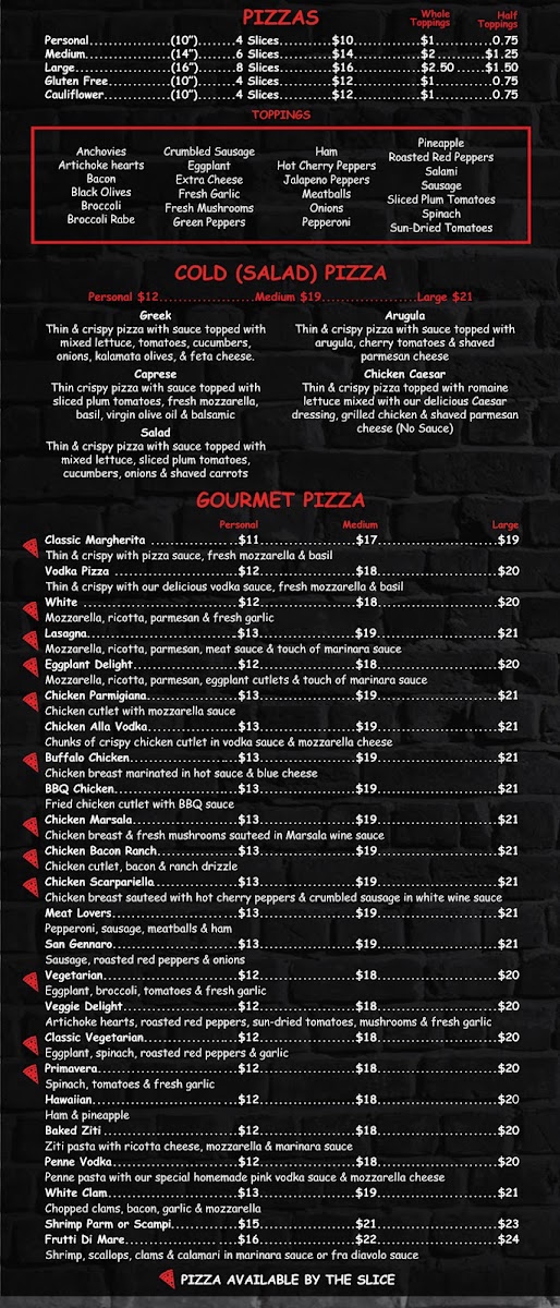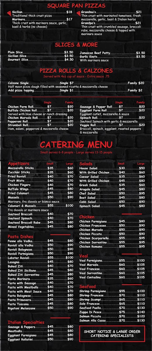 For pizza lovers, there’s plenty to choose from. Whether you prefer a Personal Pizza (10"), a Medium Pizza (14"), or a Large Pizza (16"), there’s a size for everyone. The Gluten Free Pizza and Cauliflower Pizza cater to dietary preferences. If you’re in the mood for something unique, Gourmet Pizzas like the Classic Margherita Pizza, Vodka Pizza, and Eggplant Delight Pizza will definitely satisfy your cravings. Additionally, the Square Pan Pizzas, including the Sicilian Square Pan Pizza and Grandma's Square Pan Pizza, offer a delightful twist.