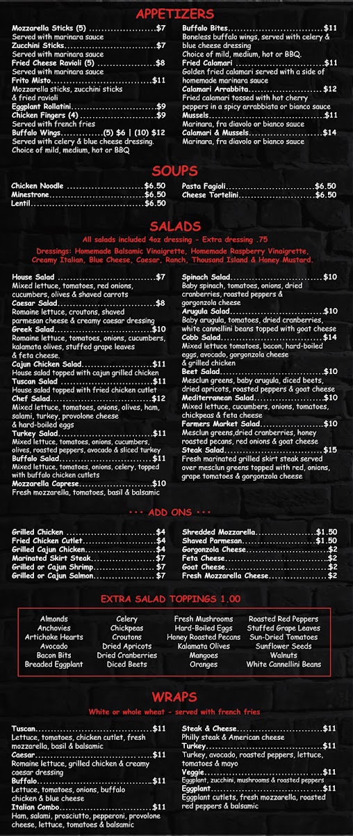 The menu at Slice Of Stamford offers an extensive variety of delicious Italian-inspired dishes, with something to suit every palate. Starting with the Appetizers, you can enjoy classic options like Mozzarella Sticks, Zucchini Sticks, and Fried Cheese Ravioli. For something a bit different, try the Eggplant Rollatini Appetizer or Frito Misto. The Soups section features comforting choices like Chicken Noodle Soup, Minestrone, and Lentil Soup, alongside the flavorful Cheese Tortellini Soup and Pasta Fagioli Soup.