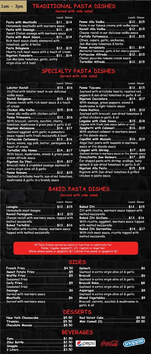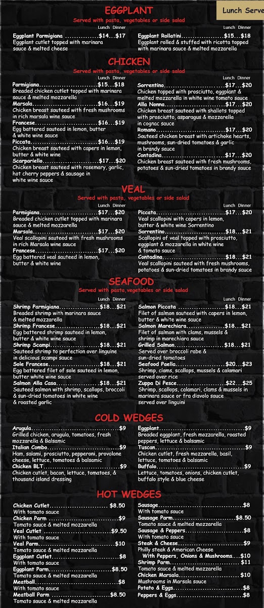 For a satisfying lunch or dinner, there’s an array of options featuring chicken, veal, and seafood. Choose from Chicken Parmigiana Lunch/Dinner or a flavorful Shrimp Francese Lunch/Dinner. The Veal Marsala and Veal Piccata are standout dishes. Pasta lovers can indulge in options like Pasta With Meatballs or Ravioli Bolognese for both lunch and dinner.